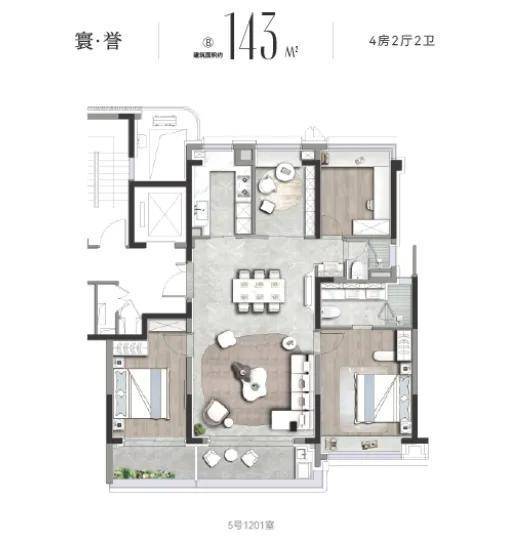 预算充足的改善家庭,还可选择约143㎡4房户型。作为内环内稀缺的控总价4房,它在尺度与舒适度上颇为出彩: