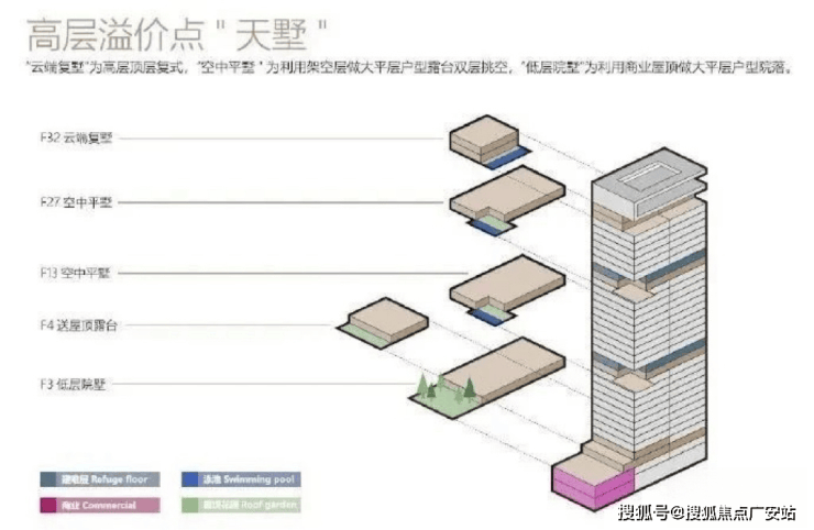叠拼面积段约195-310㎡,分为1-2F下叠、3、4、5F为中间的大平层,6-7F