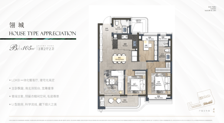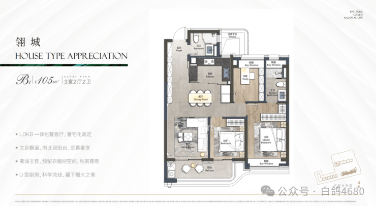 先来看项目主推建面约105㎡3房2卫: