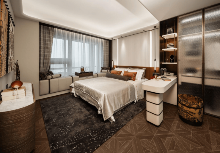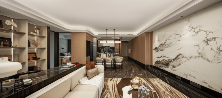 翎翠滨江通过大量的奢石、隐藏式细节将整个室内打造成了艺术的殿堂。