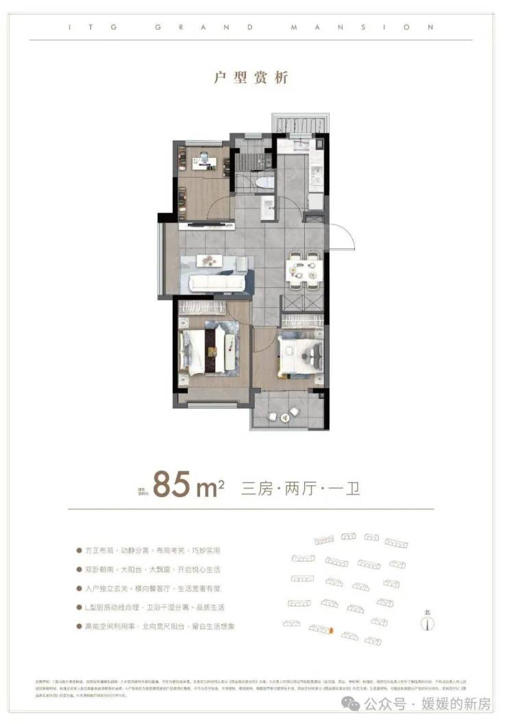 户型解析:约85㎡的3房,这种入门级的产品也要保证居住的尺度感。比如利用L形厨房与餐厅相连接,一体化的设计让空间充足利用。比如次卧连接阳台,就是人性化考虑到给他们一个私密的追光天地。