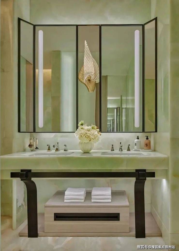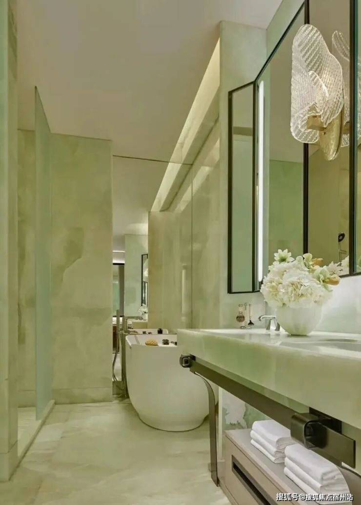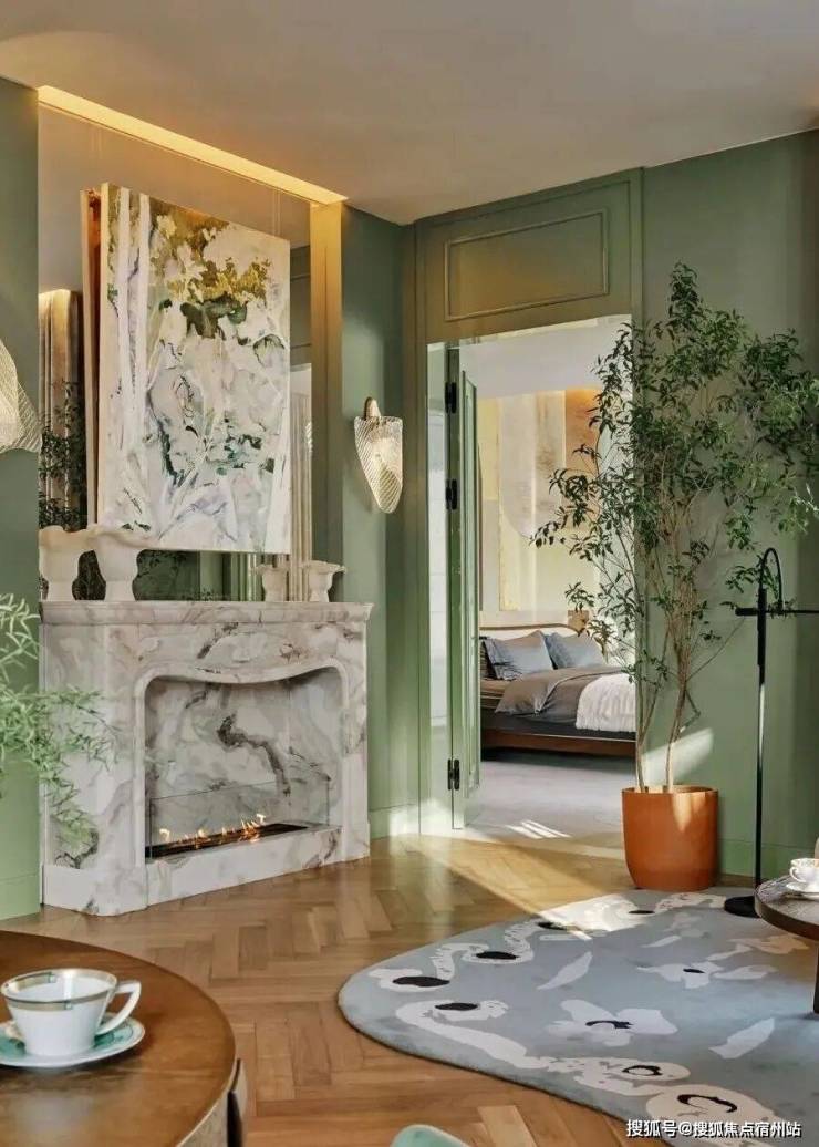 顶层下午茶区以淡绿为底,壁炉暖光漫过手绘地毯的肌理,将社交场域沉淀为冥想容器;主人房墙面缟玛瑙(Onyx)的天然流痕,也与一层屏风暗纹形成时空对位,光影在矿物晶体中生长出私密的诗。