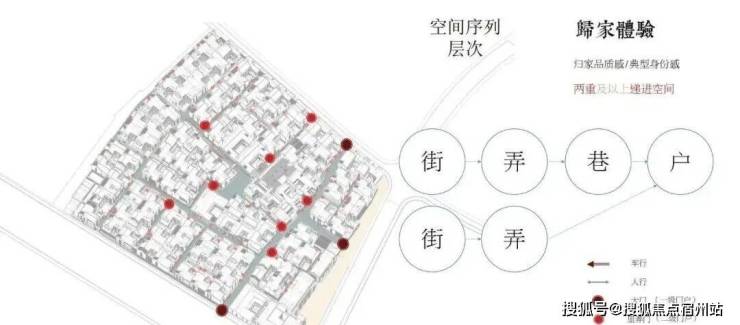 士林润园社区规划可分为蓬莱路城市公共景观以及社区内部景观两个部分,其中市政绿地衔接于上海2035城市总体规划中“蓝绿丝带”的上位条件要求,社区内部街巷空间形成空间序列形成递进的层次,将归家体验的序列依次展开,形成城市街道→入口(一级门户)→街巷→节点空间→里弄门(二级门户)→合院入户(三级门户)的方式,基本可保证大多数住户可体验到两重以上的空间递进。