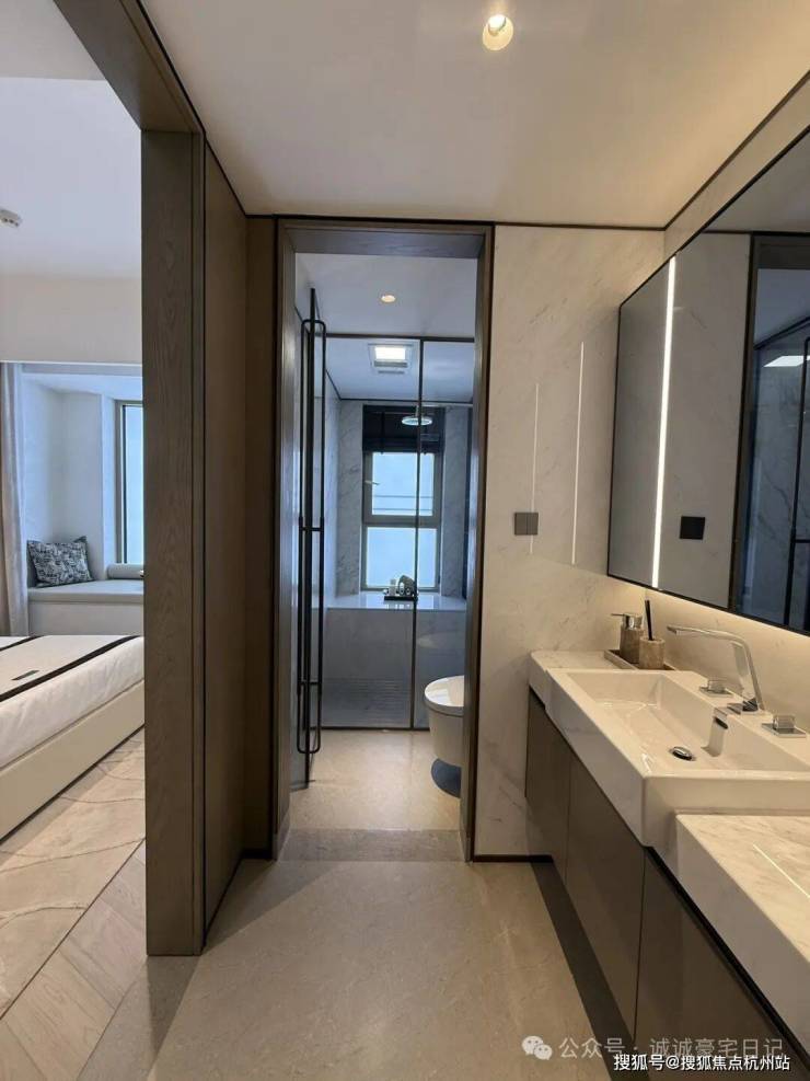 厨卫方面,西厨定制高柜,容纳嘉格纳蒸烤一体机、嘉格纳双开门冰箱、洗手台以及各类收纳空间;中厨自带嘉格纳灶具、油烟机和洗碗机。主卫配置劳芬台盆、浴缸和独立卫浴洁具空间、独立淋浴空间配备当代的花洒,顶部有松下暖风机,还配置了电热毛巾架。
