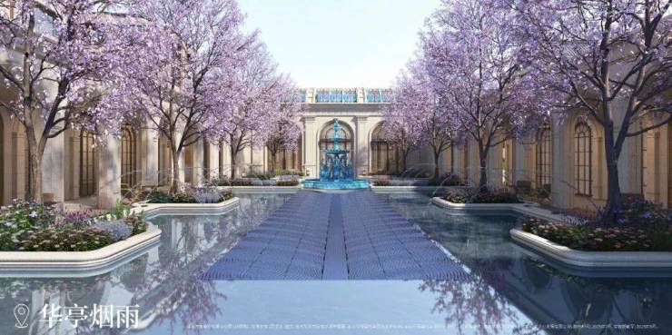 以水为引,起承转合,以海天华堂、华亭烟雨、凤亭问泉,清涟夜月、黄浦秋涛等景观组团,悠然铺陈东方院落式归家礼序。
