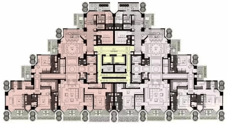 外部设计已经足够令人震撼,内部户型更是壕到无法想象。独特的金字塔设计,仪式感超强。所有住宅单元都尽可能南向,拥有360°采光的同时不浪费一丝一毫的江景。