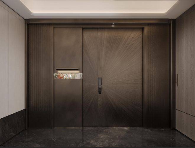 比如入户大门配备大面积的金属格栅、局部莫奈奢石