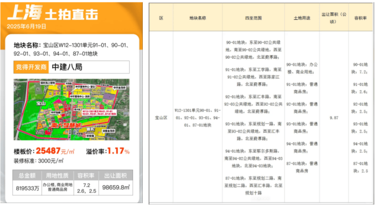 今年6月,第五批次土拍首日,中建八局以总价81.95亿元竞得南大巨无霸地块,宝山区南大地块分为5个住宅地块(容积率为2.5-2.6)和1个办公和商业地块(容积率为7.2),建设用地总面积约9.9万㎡,规划总建筑面积约32.2万㎡。