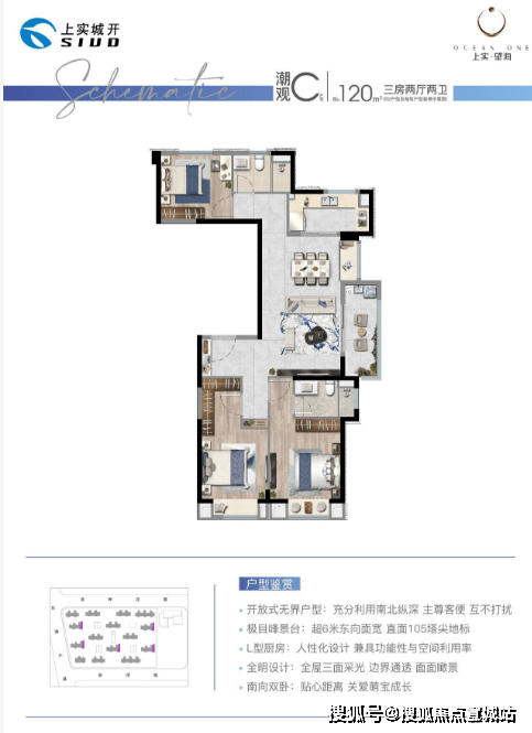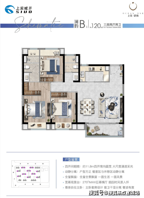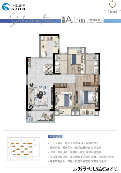 户型:主力户型为建面约 100-122㎡的三房两厅两卫。