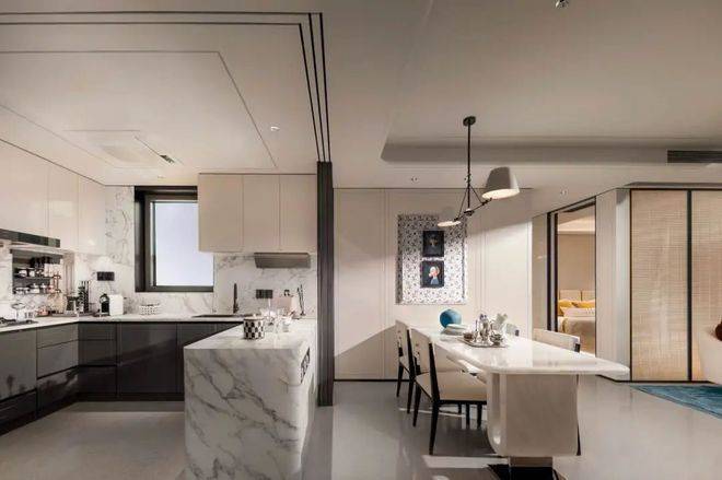 不同于市面上门是门,框是框,墙是墙,看房时“五颜六色”。外滩瑞府室内采用一体化设计语言,实现空间、色彩与材质的协调统一。比如