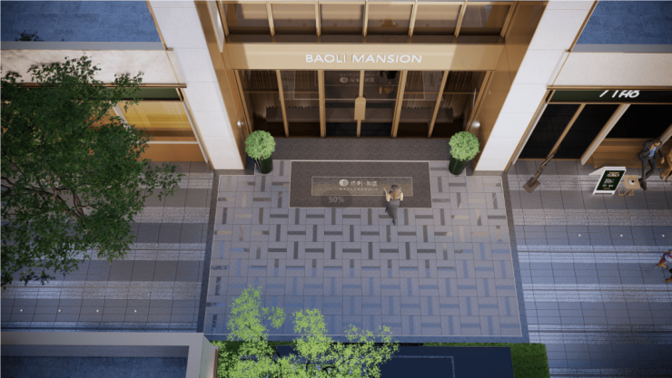 即便是公区部分,「保利虹桥和颂」依旧注重品质,门楼首层立面通过玻璃与金属的结合打造精致婉约的时尚商业形象,二层通过石材错落有致的拼贴,辅以不同表面的处理方式,展现充满活力的超长尺度形象界面。