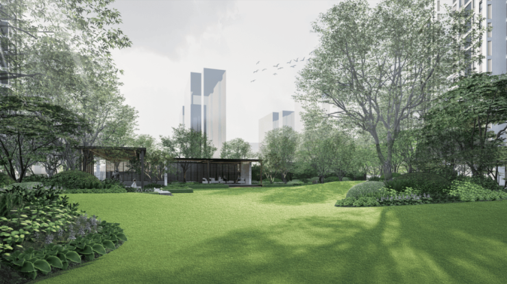 在空间上,项目让出城市街角空间形成街角绿化社区名片,约75米超长尺度城市街区生活形象,打造城市温情归家界面。同时利用项目自持的约500㎡商业配套,为业主提供家门口的休闲与便捷,也能触发更多的社交可能。