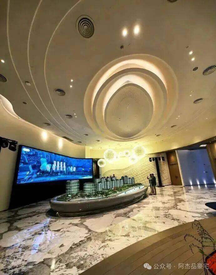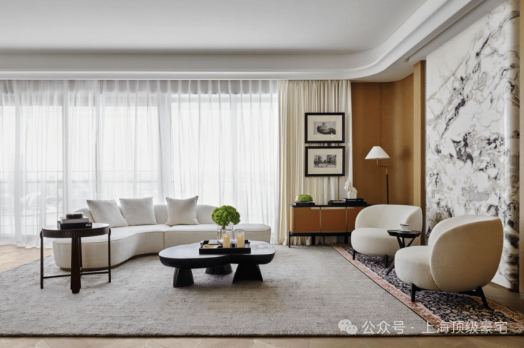 客厅空间采用大量造价昂贵的弧面设计,带来更有格调的审美价值: