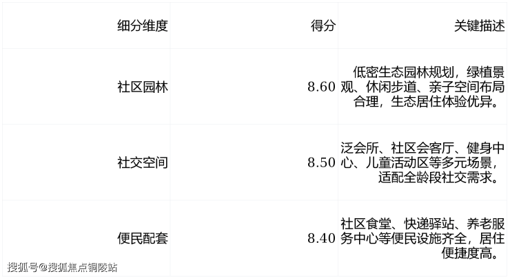 综合概述:项目社区配套贴合高端改善定位,涵盖全龄段生活、社交、休闲场景,社区配套得分 8.50,稳居竞品第 3 位,是居住品质的核心支撑。