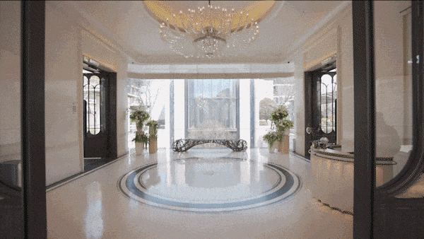 在门庭环岛空间,景墙面采用中轴对称设计布局!定制了奢石镶嵌装饰,将曲面艺术与经典石器之美-圆融交融!