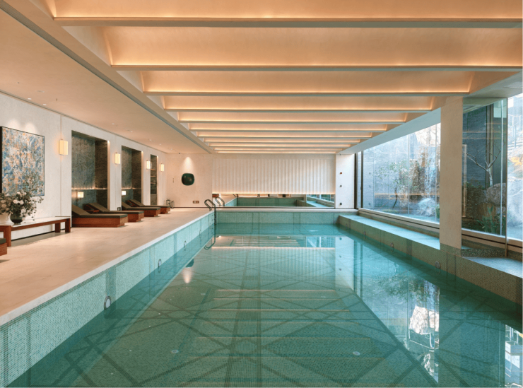 恒温泳池:采用全景落地玻璃墙,巧妙消融了室内与自然的界限。畅游其间,庭院山石如天然屏风倒映眼前,仿佛在自然山水间徜徉。