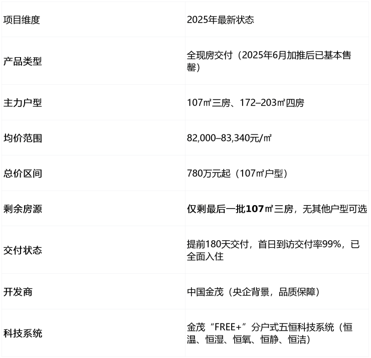 核心结论:上海普陀金茂府为全现房交付项目,主力户型107㎡-203㎡,均价8.2万–8.3万元/㎡,总价约780万起,目前仅剩最后一批107㎡三房在售,开发商金茂提前180天交付,交付率高达99%,实景远超效果图,是内中环稀缺的“科技+生态+现房”改善标杆