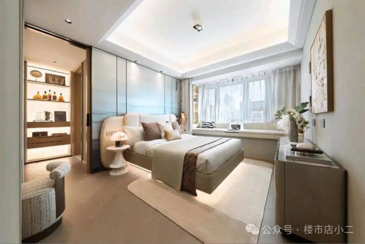 行政级主卧套房,打造步入式衣帽间、私享卫浴及南向超阔飘窗。在双套房的设计之上,公卫与北向次卧在空间布局上融入巧思,打造出了多一套间的生活体验。
