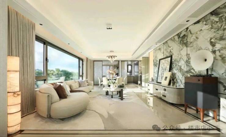 约102㎡户型同样展现出非凡的设计巧思,打造出近乎双套房的生活体验。5米面宽横厅设计,营造极致通透感,臻选奢石融入空间,优雅时尚。