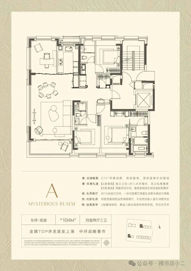 约184㎡户型采用四房两厅三卫格局,LDKB一体化设计,客餐尺度达7.5米面宽,270°极致环幕窗景,最大化引景入室,使百万方森态谧境成为私享级流动窗景。