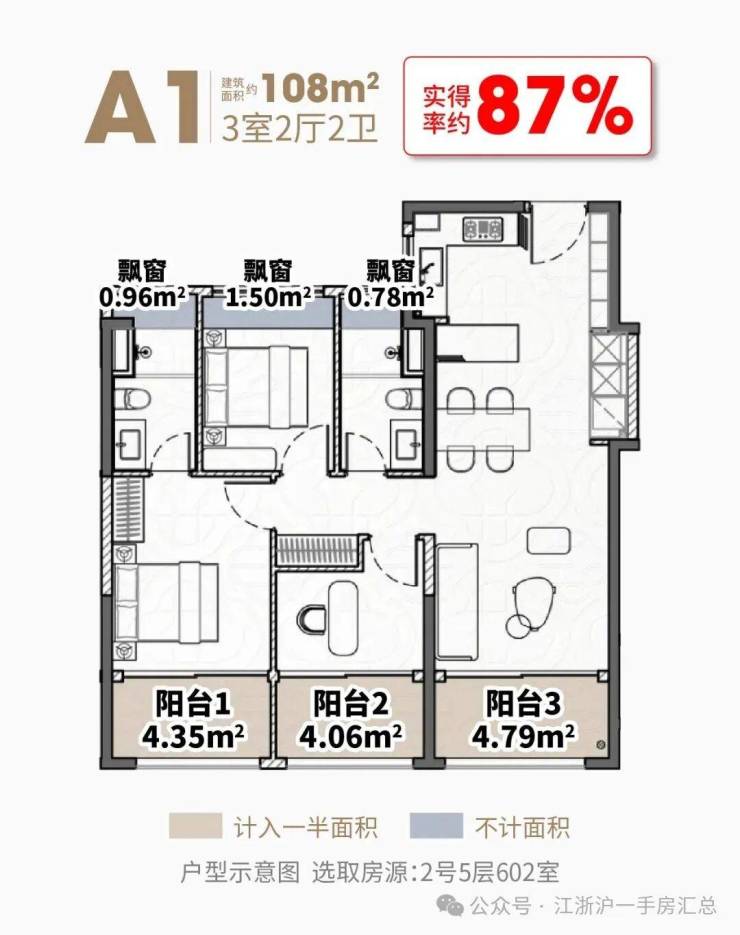 大华静安年华✅✅售楼处电话:400 - 1010 - 064✅✅建面约108㎡3房,三阳台面积达约13㎡(赠送一半),飘窗赠送约3.3㎡,室内使用面积达约94.5㎡,实得率高达约87%,总赠送面积比常规次卧都大。