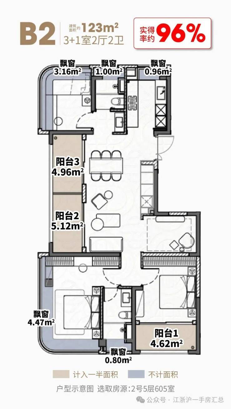 建面约123㎡4房,三阳台面积达约14.7㎡(赠送一半),5飘窗赠送高达约10.4㎡,室内使用面积约117.8㎡,实得率高达约96%,总赠送面积相当于两个次卧。