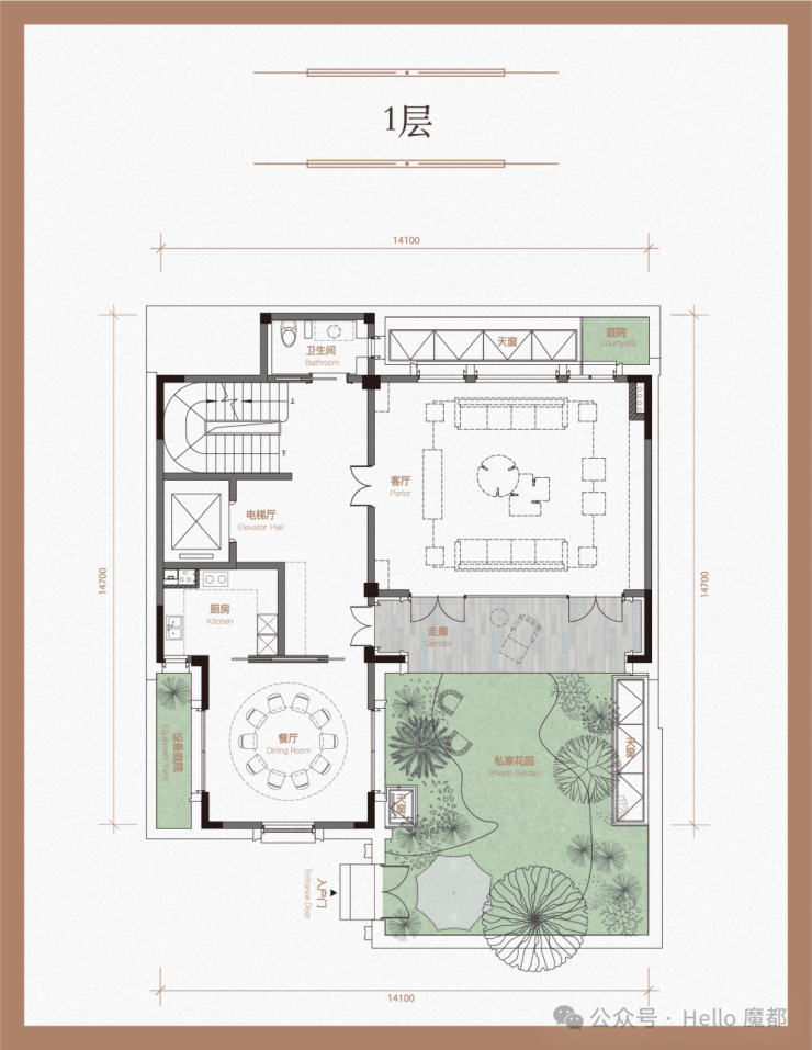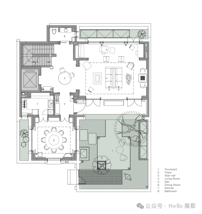 栖息院落【一层设计】入户体验始于私家庭院。在高密度的城市环境中,庭院为住宅提供了一处解压之地,一缕新鲜空气。因此,在平面布局上,我们将所有重要空间布置在庭院周边,以充分利用庭院空间。