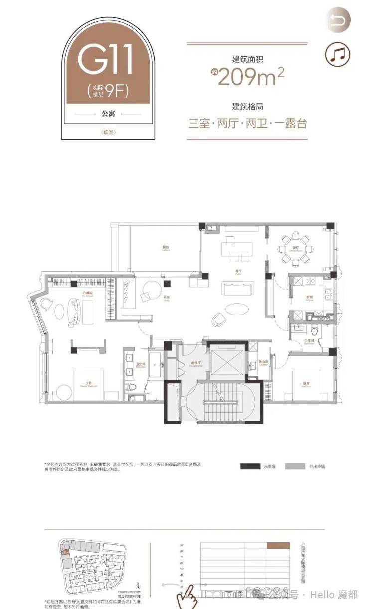 高层大平层:约209–641㎡,户型包括209㎡三室、233㎡四室、249㎡四室、298–641㎡五室及以上