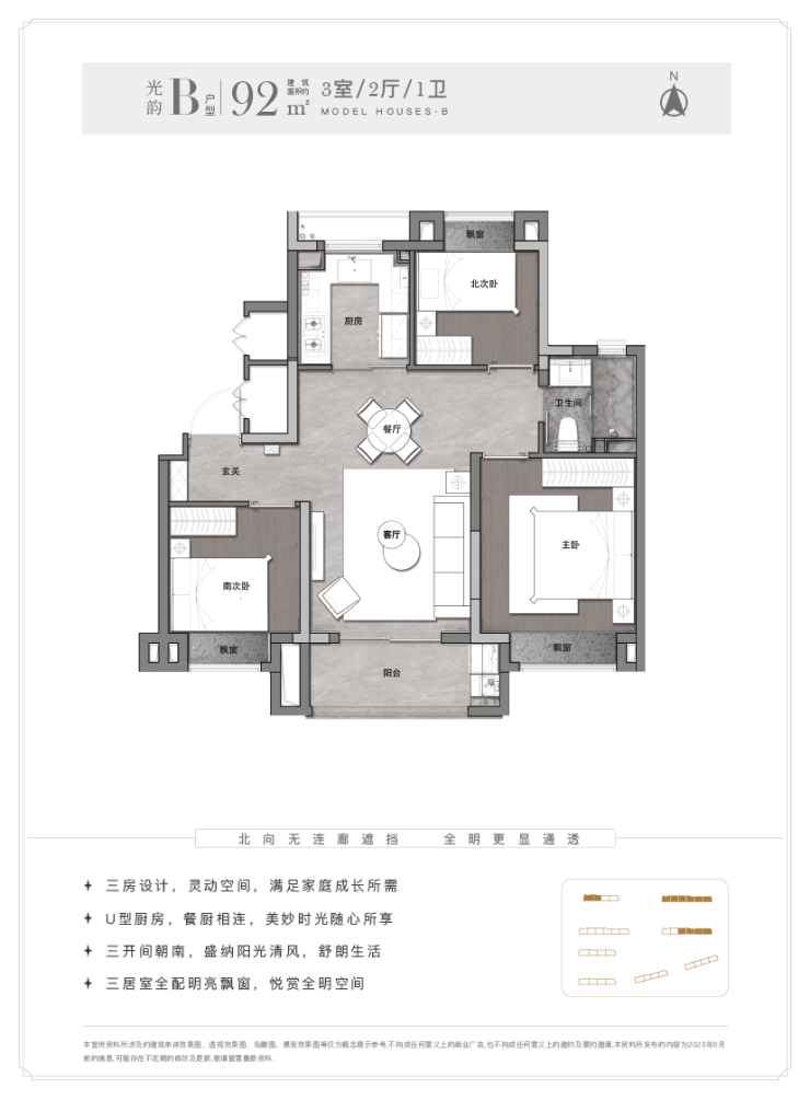 另外飞机户型能更好实现南北通透,客厅-餐厅-阳台-厨房一线连通。同时三个房间分列客厅两侧,相互独立,私密性更佳。