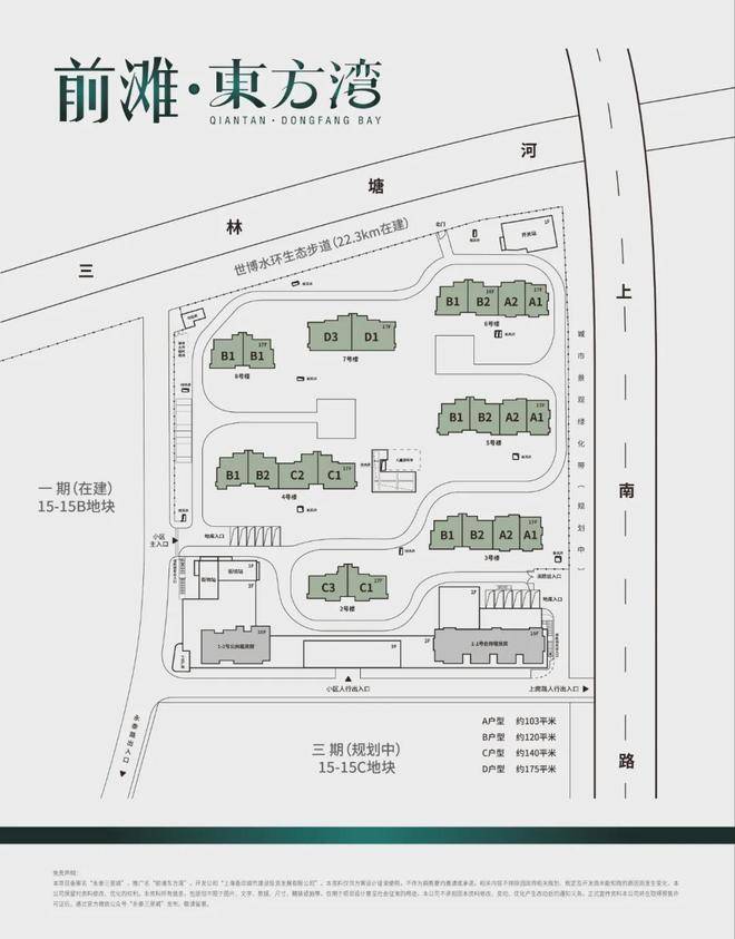 前滩·东方湾售楼处电话:400-9699-334✨【官方认证】✅✅✅位于上海浦东三林西部板块,距前滩约3公里,紧邻11号线三林站,交通便利。项目由永泰三里城二期升级而来,容积率2.0,规划7栋17层住宅,共364套房源,主力户型为103-175㎡3-4房。社区采用全铝板外立面,配套约8000㎡公共服务中心,含室内篮球场、社区餐厅等功能。户型设计升级,层高3.1-3.15米,部分类一梯一户,南北双阳台,空间利用率高。精装交付,配备大金空调地暖、博世厨电、科勒卫浴等,物业由仁恒物业提供服务。