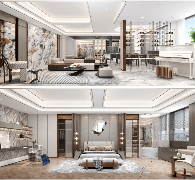 项目采用日本大金空调、德国威能地暖、美国蓝飘尔全屋净水系统(275m²无)、全屋智能系统、大阪屋(日本全进口地板)、科沃斯扫地机器人、杜拉维特台盆、汉斯格雅龙头花洒、科勒马桶、弗兰卡厨卫台盆(瑞士)、西门子洗衣烘干机、卡萨帝嵌入式冰箱、COLMO蒸烤一体机、老板厨具、洗碗机、全屋定制柜意大利博洛尼(具体以实际交付位置)。