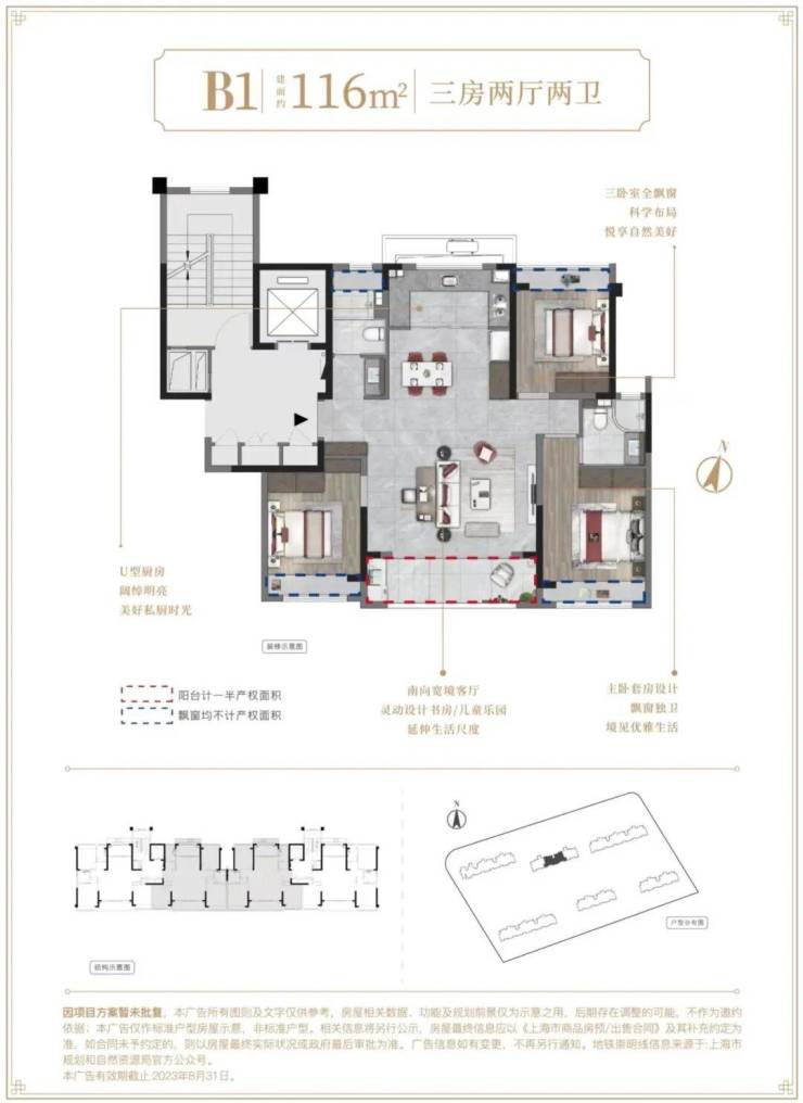 建面约116㎡3房2厅2卫▼