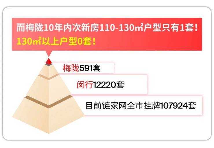 但你可能不知道的是,据最新数据统计,目前链家网全市挂牌107924套,闵行12220套,梅陇591套,而梅陇板块10年内次新房110-130㎡户型的挂牌只有1套!130㎡以上户型更是零封,1套都没有!