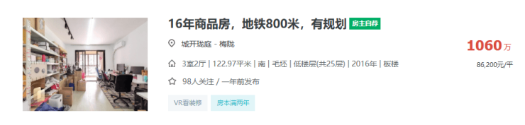 小胖君在链家网找到了这套挂牌,近10年房龄的低楼层,建面约123㎡3房挂牌单价86200元/㎡。
