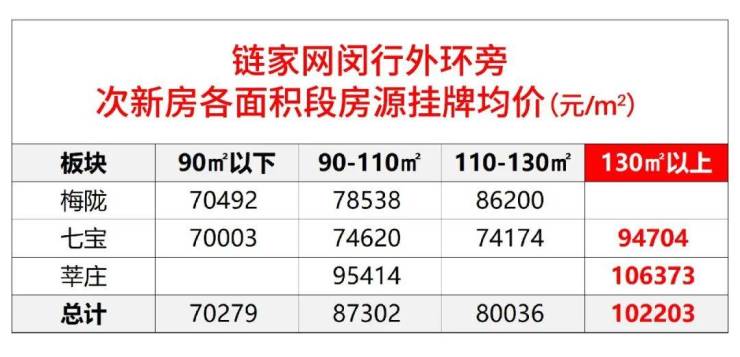 但梅陇没有130㎡以上的挂牌,所以我把比较范围放大到整个闵行外环附近,发现闵行外环的大户型是真的吃香:七宝130㎡以上二手房挂牌约9.5万/㎡,莘庄更是约10.6万/㎡。