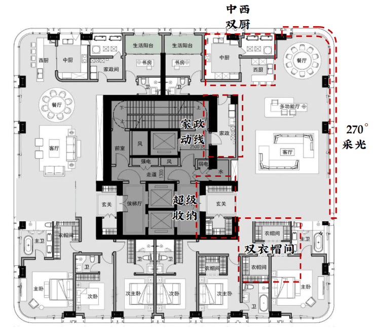 针对高净值客户,私密性显然是最重要的。电梯双开门设计,家政服务人员也有单独出入动线,尽可能减少对业主的影响。