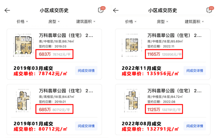 以张江万科翡翠公园为例,2019年二手房成交价为7.87-8.07万/㎡,2022年最新成交价已经涨至13.27-13.59万/㎡!