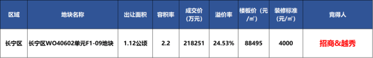 2024年第八批次土拍首日,招商&越秀以总价21.82亿元竞得长宁区仙霞社区地块(长宁区W040602单元F1-09地块)。溢价率24.54%拿下。折合楼板价88495元/㎡,装修标准4000/㎡。