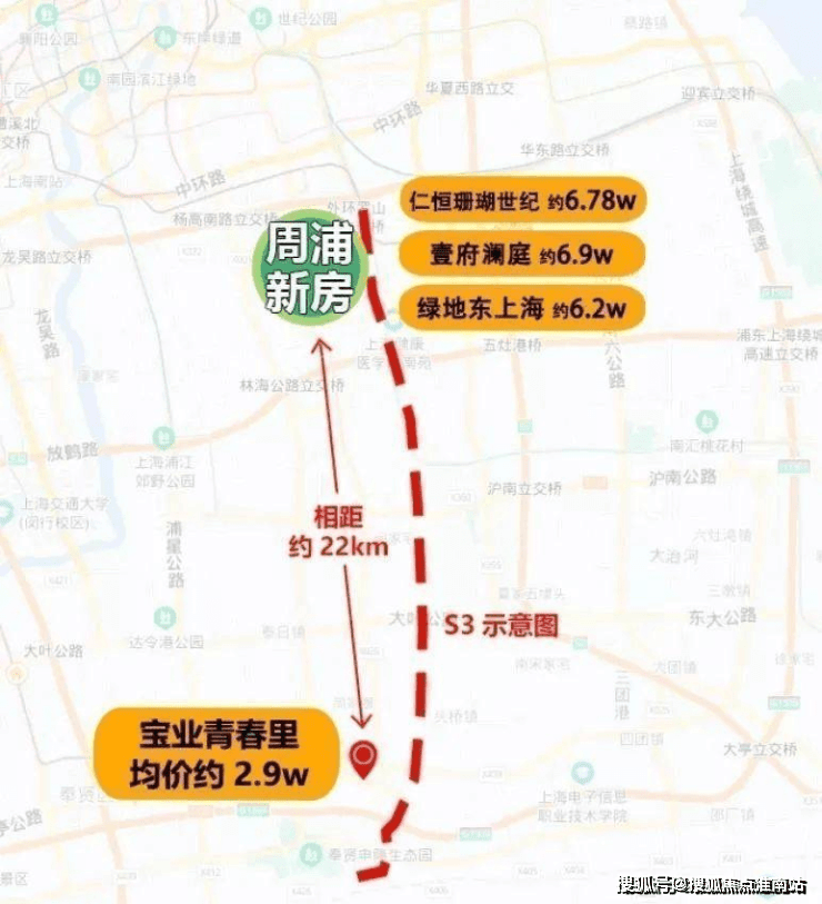 但是我们纵览S3(在建)沿线的房价,已经形成了明显的价格剪刀差,近期周浦供应的新房,均价在约6.2-6.9w/㎡,而张江地区暂无新房供应。