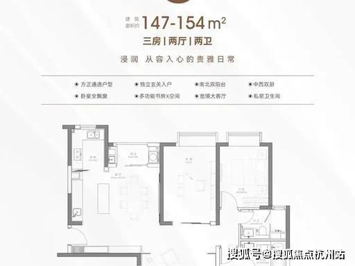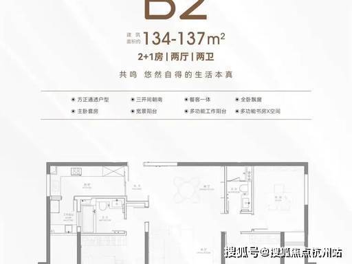 B2 户型|134-137㎡ 2+1 房 2 厅 2 卫:南北通透,灵动 X 空间可做书房 / 儿童房,中西双厨设计,满足多元化生活需求。