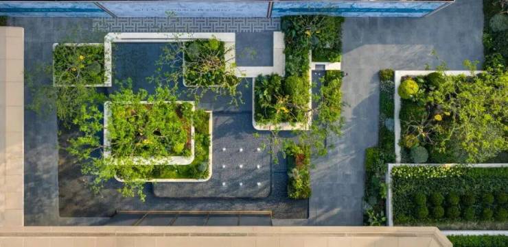 7号楼架空层以“睦邻空间”为定位,设置无界交融过厅、冥想区与花木小庭,在都市中营造一片自然绿洲;