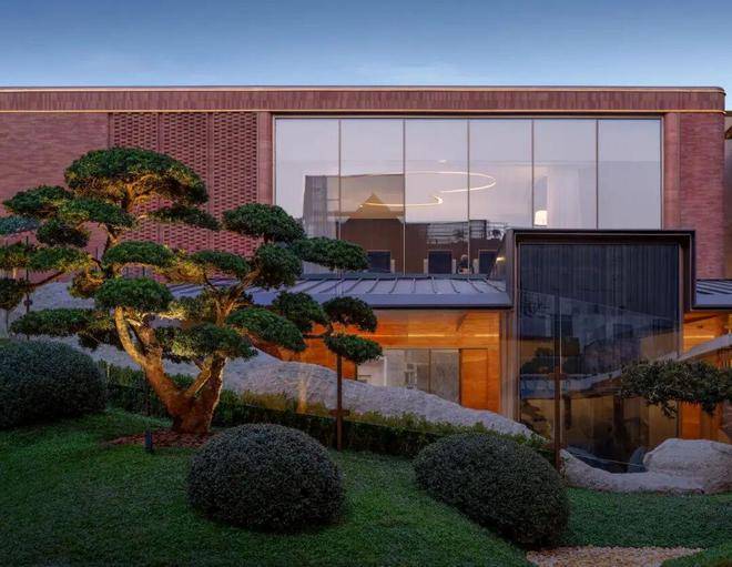 第一重-堂前会客,这里首先营造了满满的社区入户的仪式感,通过红色陶砖与红洞石以及大面落地玻璃营造出了层次丰富的艺术立面。营造业主在家庭空间以外进行接待交往的处所。