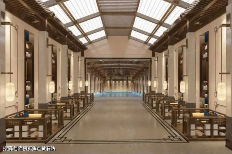 主入口宽20米、高8米,采用黄色木纹洞石、汉白玉、黄铜等名贵材料,搭配以《千里江山图》为蓝本的影壁墙,彰显磅礴气势。