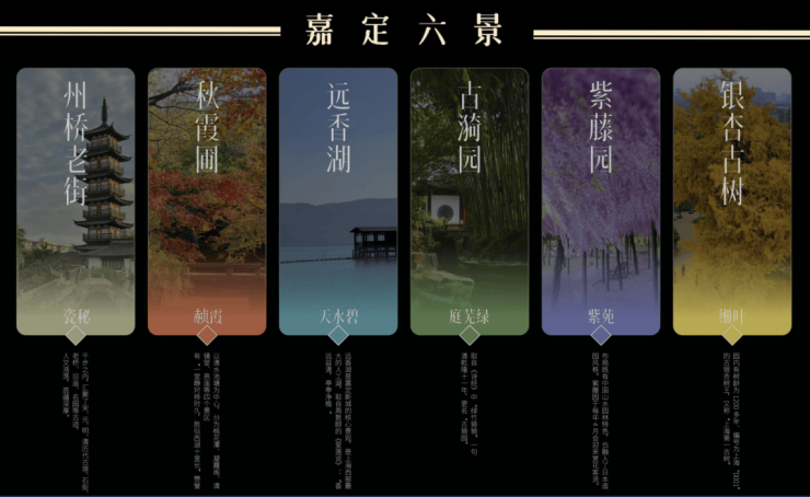 建筑们围合出的中心花园中,州桥老街、秋霞圃、远香湖、古猗园、紫藤园、银杏古树等嘉定6景被南山地产提炼、转译,形成了具有在地文化特色的6大景观主题空间。
