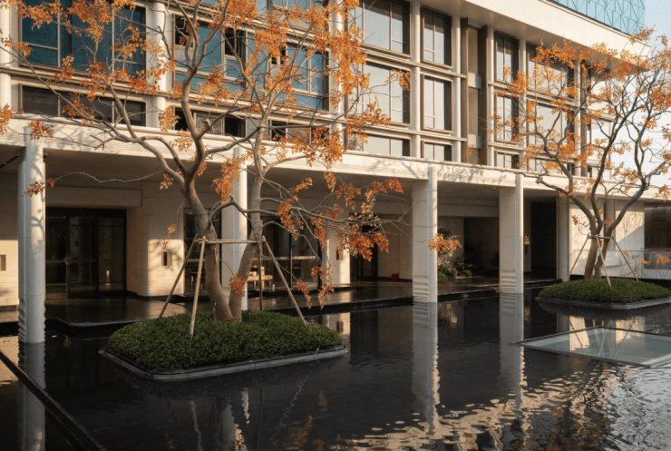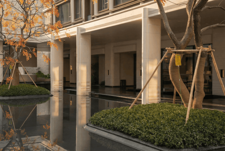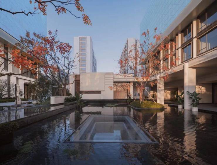 建筑采用 现代简约美学风格 ,立面以浅灰色铝板搭配大面积玻璃幕墙,线条简洁流畅、质感高级通透,契合高知精英审美。社区景观以 “ 河居森境、六重水系 ” 为核心理念,南邻天然三林浦河滨水绿带,内部打造中央水景、阳光草坪、全龄活动区、樱花步道、宅间花园等多维景观,内外双园生态、四季有景,推窗见绿、出门亲水,在繁华城芯实现 “出则繁华、入则静谧” 的理想栖居。