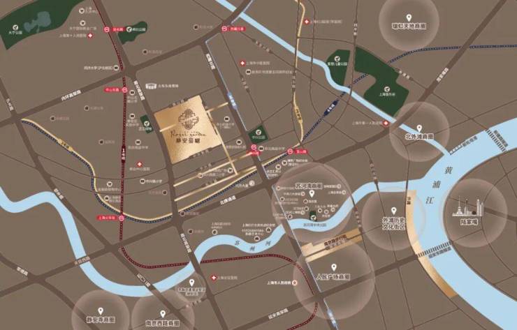 以静安玺樾为圆心,约4公里范围内覆盖外滩、南京西路、陆家嘴、人民广场、静安寺、北外滩等繁华CBD;约2公里内有静安大悦城、苏河湾万象天地、凯德虹口商业中心等成熟商圈,周围还有百万方中兴城商业(在建)、合生汇(在建)等重磅商业体;以及2公里内有上海市中医医院、上海第十人民医院、上海市第一人民医院、上海市长征医院多所三甲医院形成的便捷医疗圈。