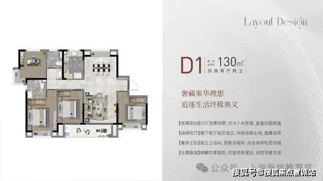 D1户型、建面约131㎡,四房两厅两卫