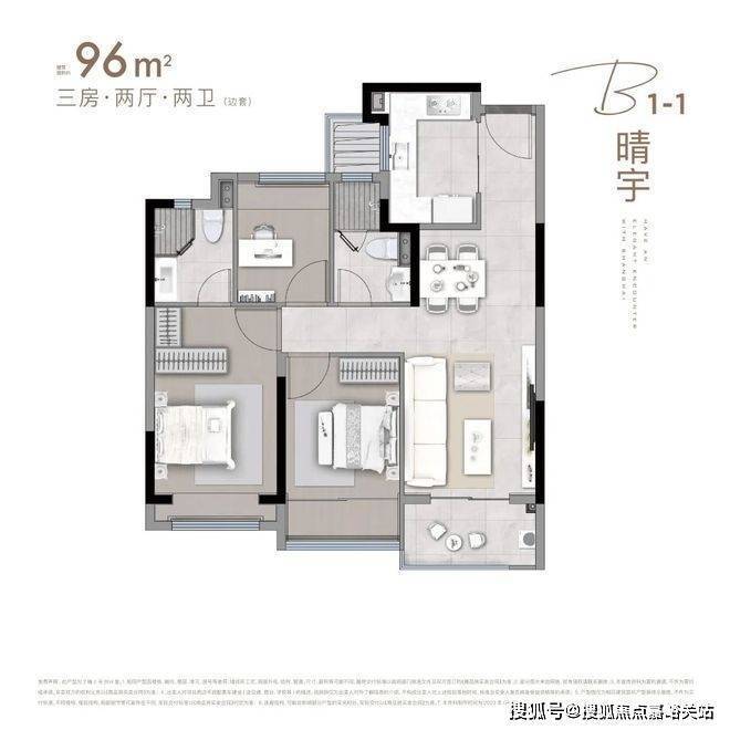 项目建面约96㎡户型实现了3房+主卧套房设计,功能性和舒适度兼备。