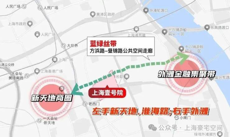 距离新天地直线距离约400米,作为蓝绿丝带规划上的关键节点,随着大新天地东进南拓战略逐步实施,通过水景、绿地和公共空间,串联新天地、豫园、外滩三大世界级商业版图。
