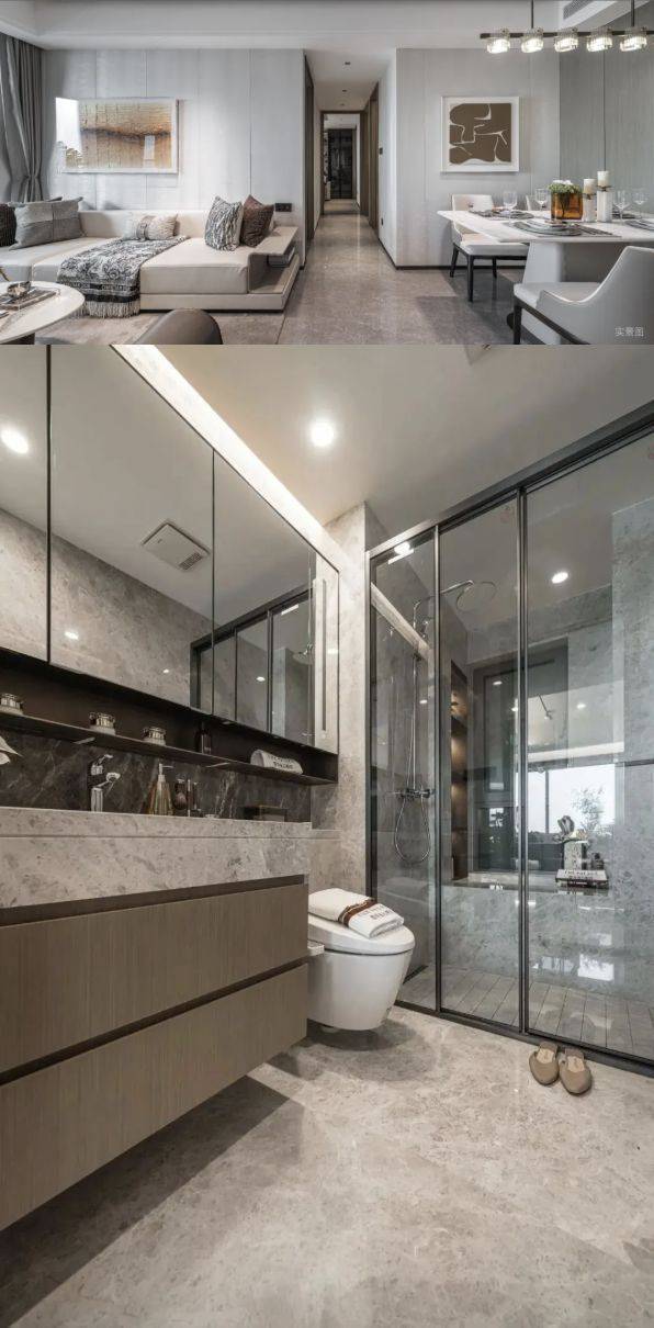 所有户型全屋墙纸交付,✅✅中环云悦府售楼处电话:400-8787-740✅✅连电视机背景墙岩板以及主卧背景墙都是交付标准,卫生间甄选不同的石材,以此来满足功能区的需求。